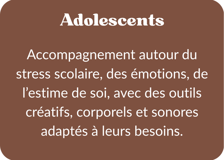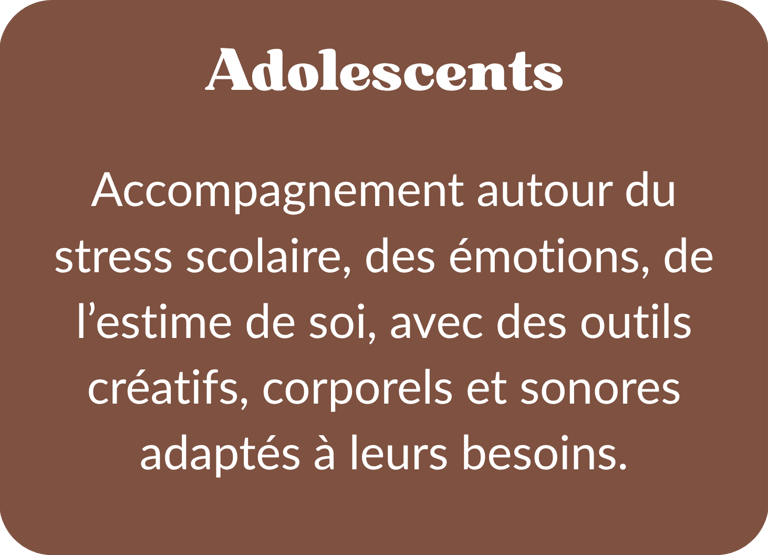 En individuel ou en groupe. En cabinet ou à domicile, dans votre structure (secteur médico-social, secteur social, éducatif et culturelle, en entreprise...) . Chaque séance est pensée comme un espace de pause, d’écoute et de transformation.